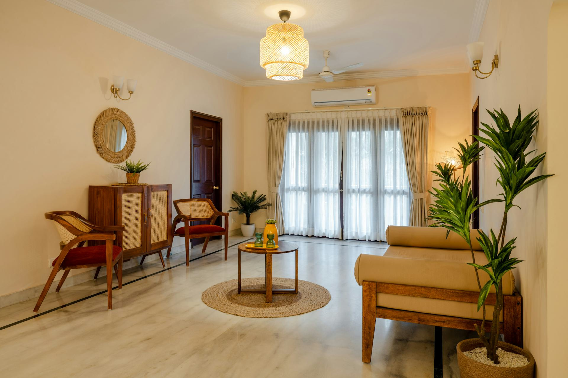 Farverne på gulv, møbler og tekstiler bør spille sammen – men ikke nødvendigvis være ens. En god tommelfingerregel er at skabe balance mellem lyse og mørke flader.