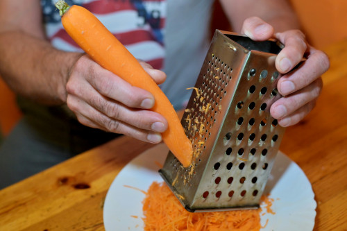 Brug et rivejern med skridsikkert håndtag og eventuelt en beskyttelseshandske eller madholder. Riv langsomt og med kontrollerede bevægelser for at minimere risikoen.